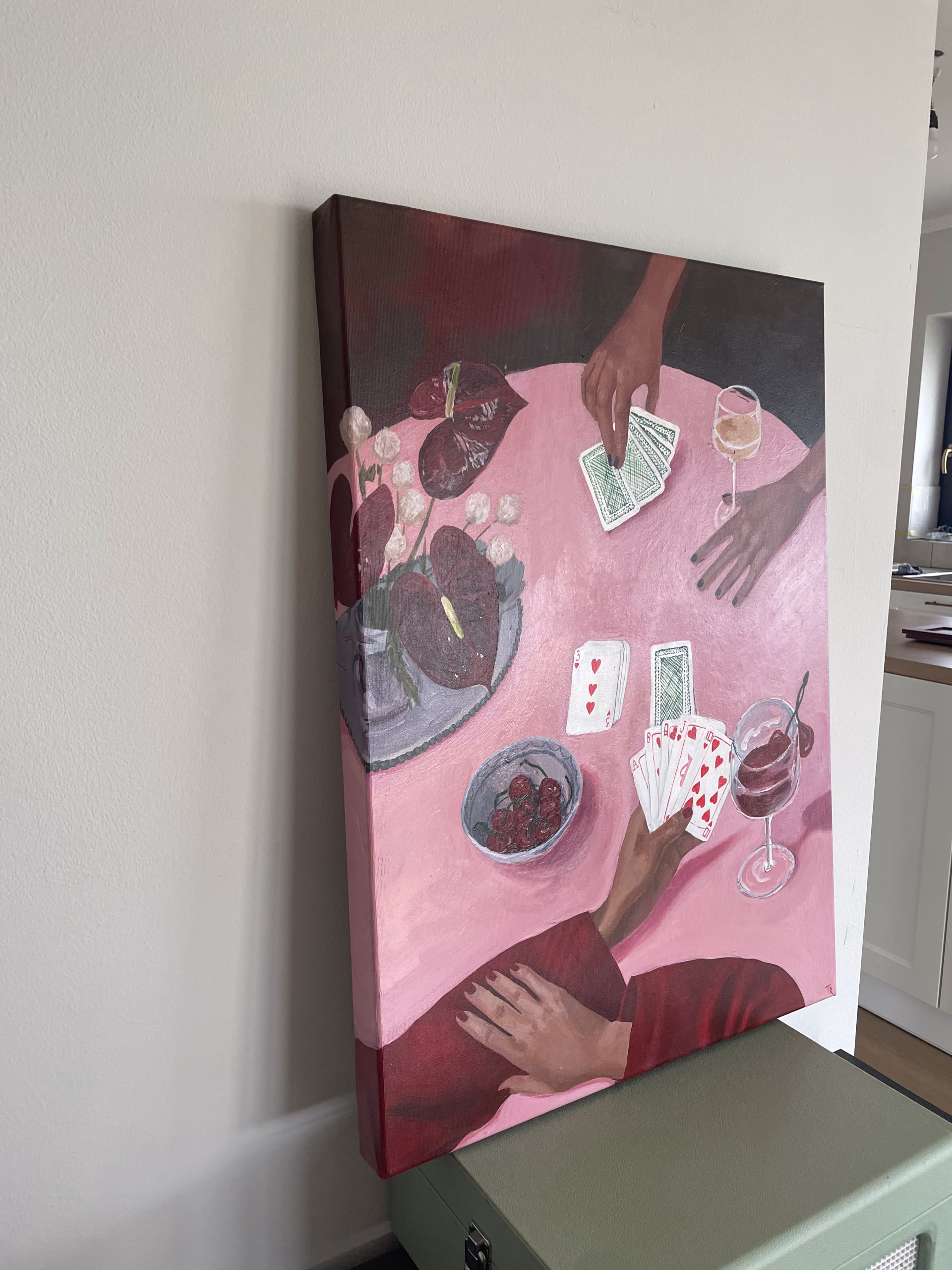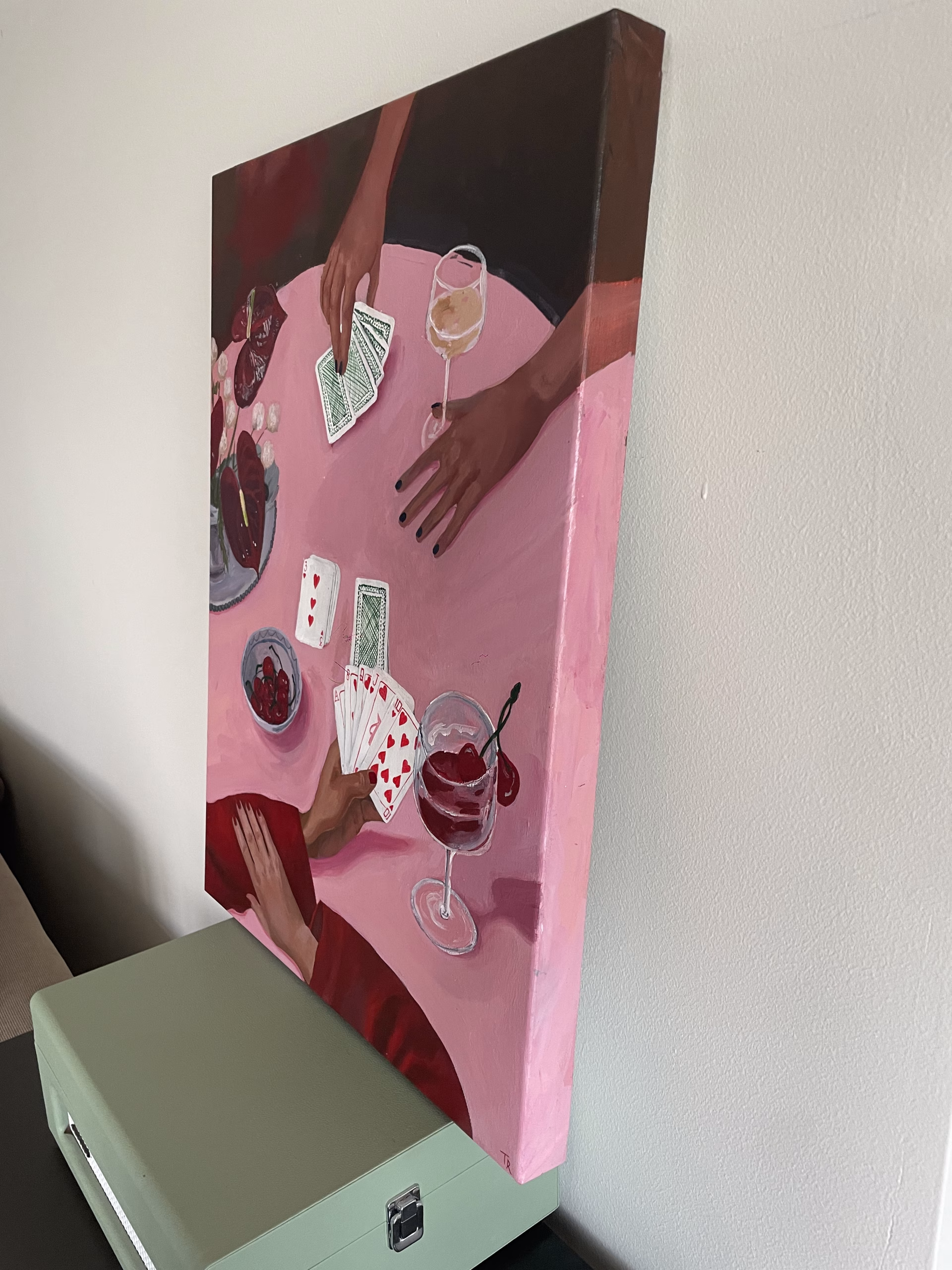 “Ace of pink” is a acrylic color painting on a high quality sturdy canvas with thick wooden frame. The rim is painted, providing you with no need for framing the painting for it to look good on your walls.